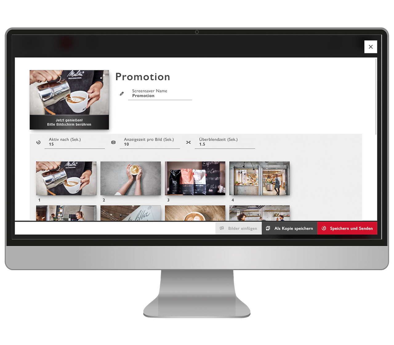 With specially designed screensavers, you can inform your guests about daily special offers , advertise suitable snacks for your coffee specialties and much more.
